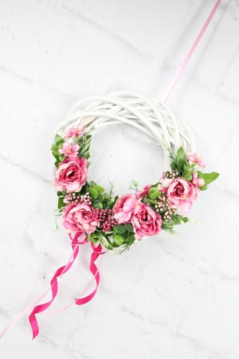Wianek wiklinowy wybielany o średnicy 25cm udekorowany kwiatami peoni i jaśminu w odcieniach fuksji.