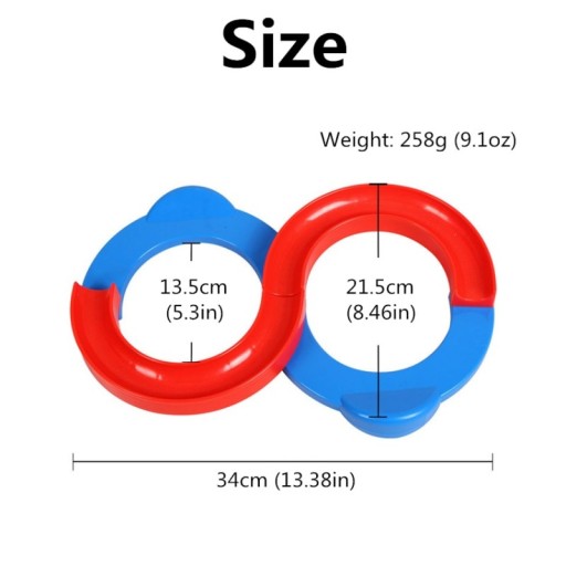 W skład zabawki wchodzą dwie gumowe piłeczki, tor złożony z 2 czerwonych części i dwie płaskie części niebieskie z uchwytami, które służą do modyfikowania kształtu toru.