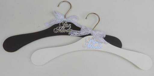 Przykład wieszaków z napisami plexi - surowe wieszaki, farby i koronki do kupienia na innych naszych aukcjach