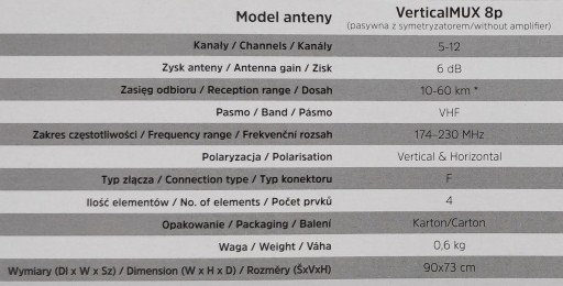 VERTICALMUX 8p to nowoczesna wersji pasywnej anteny z symetryzatorem. Zaprojektowana została do odbioru cyfrowej telewizji naziemnej DVB-T/T2 w paśmie VHF (MUX8).