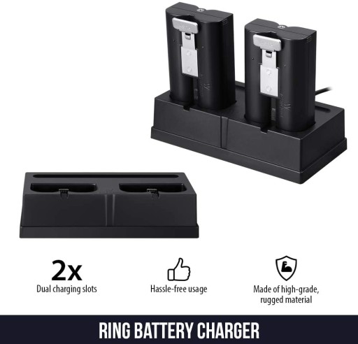 NIEZAWODNY ŁADOWACZ DO TWOICH AKUMULATORÓW PIERŚCIENIOWYCH - Naładuj akumulatory aparatów Ring i dzwonka wideo za pomocą stacji ładującej Wasserstein. Nasza stacja dokująca może ładować do dwóch akumulatorów jednocześnie. Umożliwia wymianę baterii w aparacie / dzwonku wideo poprzez zamianę na gorąco, zmniejszając w ten sposób przestoje.
