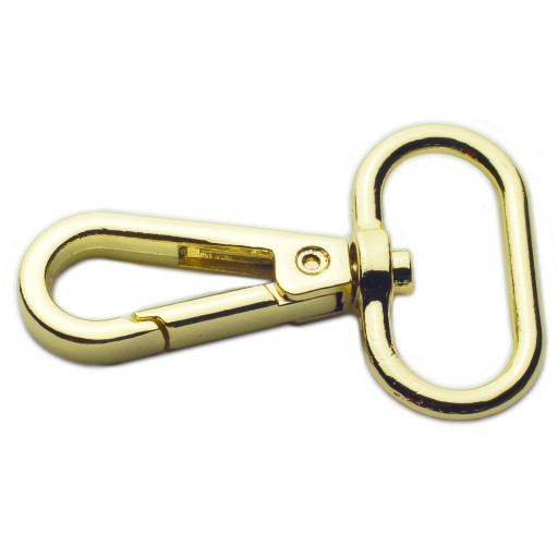 Karabińczyk z wewnętrzną sprężynką, połączony obrotowo z owalem. Zestaw mierzy ok. 50 mm długości. Prześwit oczka to ok. 25,5 mm. Produkt wykonany z metalu pokrytego niklem w kolorze złota.