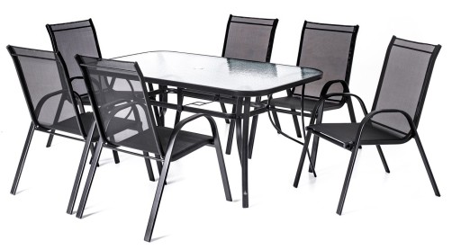 Stół ogrodowy idealny do Twojego ogrodu. Stelaż został podwójnie lakierowany proszkowo, co idealnie przystosowuje ten produkt to zastosowania wewnątrz jak i na zewnątrz. Użyte materiały nie wymagają częstej konserwacji, są odporne na warunki pogodowe i nie wymagają specjalnych środków do pielęgnacji. Nóżki są dodatkowo zaopatrzone w nakładki z tworzywa sztucznego.Stół posiada blat z przezroczystej hartowanej szyby o gr. 5 mm, z otworem na wstawienie parasola ogrodowego.