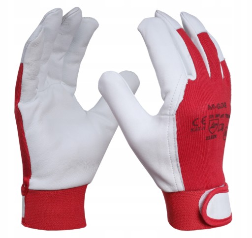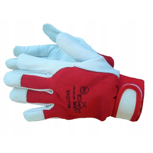 Część chwytna z jednego kawałka skóry, wierzch rękawicy z elastycznej czerwonej tkaniny.