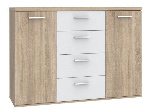 Duża komoda do pokoju dziecięco-młodzieżowego Winnie wykonana została zgodnie z najnowszymi trendami. Mebel posiada podwójne drzwiczki i cztery szuflady, a modne zestawienie kolorystyczne pozwoli dopasować go do różnych aranżacji. Charakterystyczny styl komody tworzy pogrubiony górny wieniec oraz uchwyty w kolorze aluminium. Mebel przyda się do przechowywania odzieży, książek, podręczników czy zabawek.
