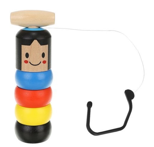 Kolorowy, drewniany ludzik w łatwy sposób pozwala na odrobinę magii! Animacje powstają poprzez naciągnięcie linki, na jej końcu znajduje się haczyk, który pozwala na zaczepienie np. o bluzkę. Ludzik dzięki naciąganiu linki podskakuje broniąc się przed uderzeniem młotkiem. A nawet gdy zostaje zwalony i zmiażdżony szybko się odbudowuje – wystarczy z powrotem naciągnąć linkę.