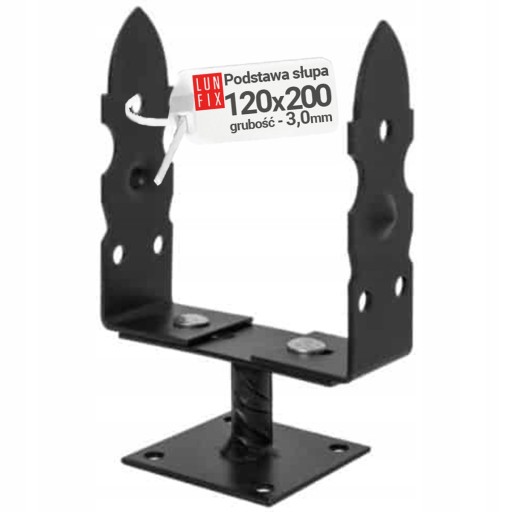 Podstawa słupa regulowana przykręcana służy do mocowania drewnianych słupów nośnych w twardym podłożu, np. betonie, drewnie, stali. Podstawa z blachy 4 mm umożliwia montaż do powierzchni za pomocą kotw i śrub.