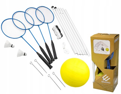 Zestaw do siatkówki i badmintona Enero 5w1 idealny do rozgrywania meczów i aktywności sportowej na świeżym powietrzu, w parku, ogrodzie, czy na plaży. W zestawie wszystko co potrzebujesz do gry w siatkówkę i badmintona. Wszystko bardzo łatwe w montażu. Z montażem i demontażem poradzi sobie każdy osoba. Zestaw zawiera: siatkę, sznurek, słupki, 4 śledzie, piłke do siatkówki, 6 metalowych rurek, 4 rakiety do badmintona,2 lotki.