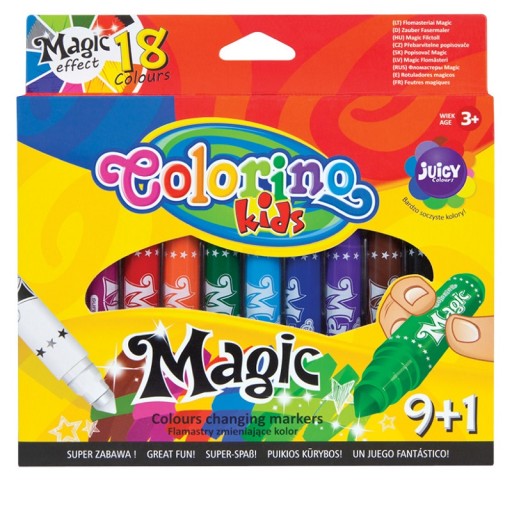 Zestaw 10 magicznych flamastrów (9 kolorów + 1 magiczny mazak) marki Colorino. Flaamstry mają intensywne kolory i wygodną, stożkową końcówkę. Magiczny mazak zmienia kolor narysowany jednym z 9 flamastrów, dzięki czemu powstaje ich aż 18. Stożkowa końcówka umożliwia rysowanie kresek o grubości od 1 do 4 mm. Flamastry łatwo zmywalne i spieralne. Tusz na bazie wody. Kolory w opakowaniu: różowy, czerwony, pomarańczowy, zielony, niebieski, granatowy, fioletowy, brązowy i czarny + magiczny, biały pisak.