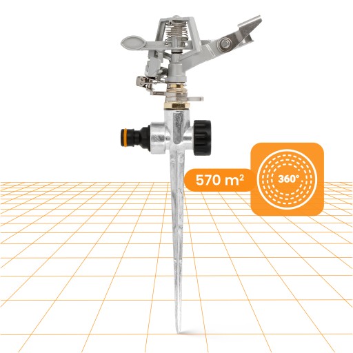 Bardzo dużą zaletą jest przelotowa budowa - dzięki niej podepniesz produkt do innych zraszaczy, tworząc rozbudowany system nawadniania nawet bardzo dużych ogrodów. Jest w stanie zapewnić zraszanie na obszarze 570 m2.