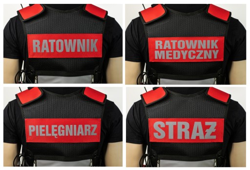- duży napis odblaskowy na rzep (do wyboru na czerwonym lub czarnym tle)