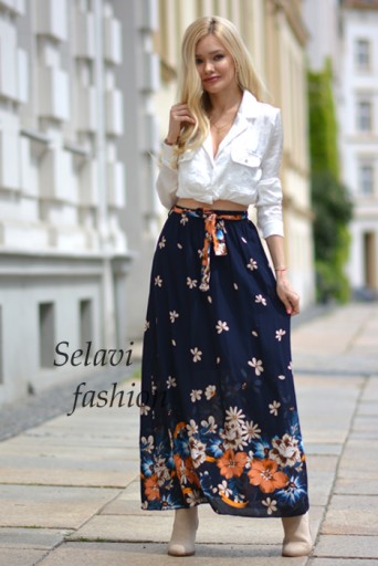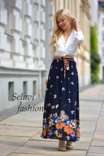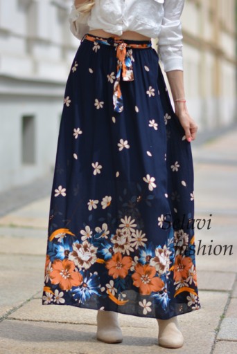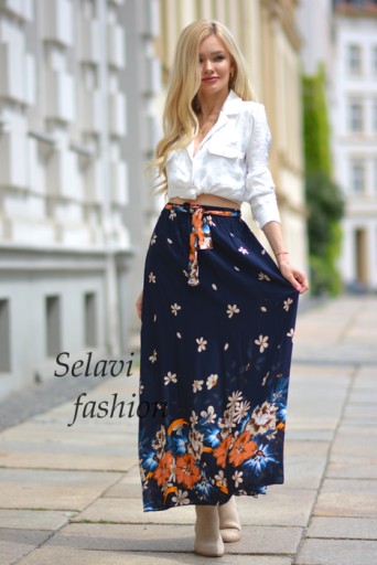 Długa spódnic a z ozdobnym kwiatowym nadrukiem. Dzięki gumie w pasie pasuje na każdą sylwetkę. Dodatkowo ozdobna wiązana szarfa. Spódnica podszyta krótką podszewką.