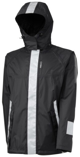 Kurtka rowerowa wykonana z oddychającego materiału PORAY 5000 (oddychalność 5 000 gr/m2/24godz., nieprzemakalność 5 000 mm H2O) z podszewką typu mesh (siatka). Zwijana do kieszeni z możliwością przypięcia w pasie na gumowym pasku. Odpinany kaptur. Dzięki zastosowanym odblaskowym nadrukom użytkownik jest widoczny z dużej odległości i pod różnymi kątami.