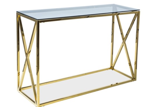 Konsolka Elise C to odważne połączenie kolorystyczne i nieprzeciętna koncepcja designerska. Jej blat stanowi tafla hartowanego szkła dymionego, podparta na stabilnym stelażu wykonanym z metalu w kolorze złotym. Dzięki takiemu połączeniu stanowi ciekawy, wyrazisty element dekoracyjny każdego salonu, pokoju czy sypialni.