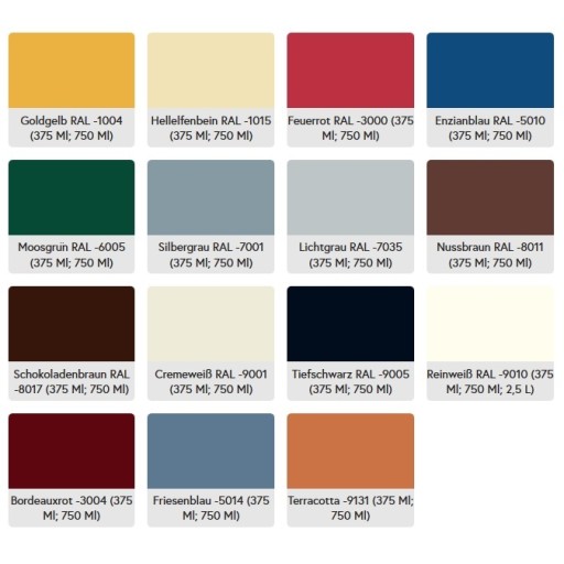 Acryl Seidenmattlack – akrylowy kolorowy lakier i podkład gruntujący w jednym. Półmatowy, wzmacniany poliuretanem. Dobrze kryjący, odporny na warunki atmosferyczne. Stosowany na podłoża drewniane, metalowe (po uprzednim zagruntowaniu) i na twarde PCV.