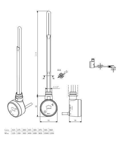 Długość elementu grzewczego wynosi 300 mm (± 5 mm).