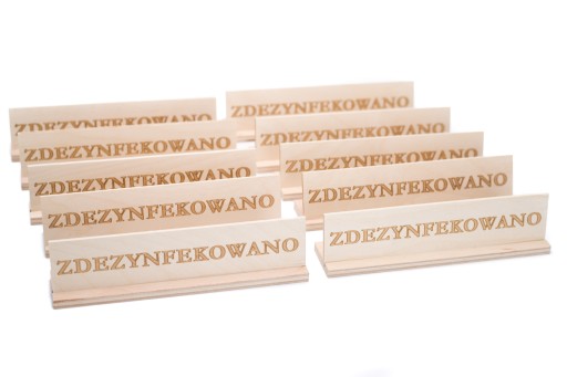 10 sztuk Drewniana tabliczka przymocowana do solidnej podstawki z wyraźnym grawerowanym napisem ZDEZYNFEKOWANO.