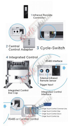 Dodatkowe opcje :: czarna ramka dowolnej grubości, czarny górny pas rozbiegowy dowolnej szerokości, malowanie kasety na dowolny kolor RAL, profil kasety owalny albo kwadratowy, system napinaczy bocznych płótna, ultra cichy i szybki silnik, sterowanie (klawiszowe/radiowe RF/na podczerwień IR/Trigger 12V lub 230V/RS-232/inne dowolne), ...