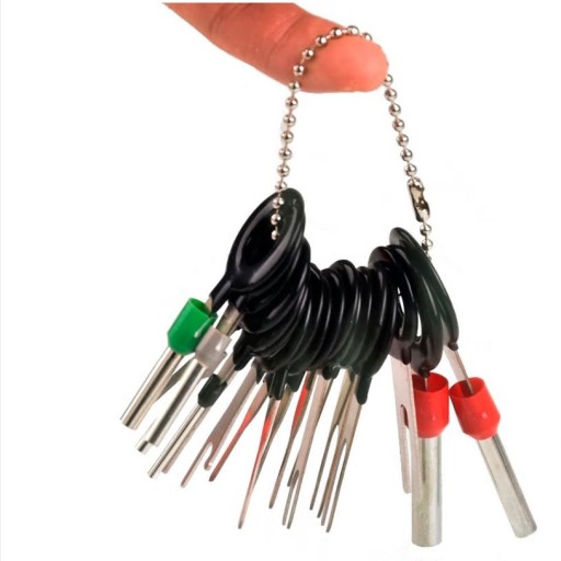 Teraz też - już nie urwiesz żadnego przewodu przy demontażu!!! Wyjmaki są bardzo łatwe w użyciu. Komplet zawieszony na stalowym, rozłączanym łańcuszku, uchroni przed zagubieniem oraz pozwoli na szybkie odszukanie właściwej wielkości klucza.