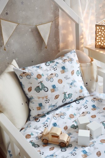 W skład dwuelementowego kompletu wchodzi kołderka z antyalergicznym wypełnieniem w rozmiarze 120x90cm oraz płaska podusia 40x60cm.