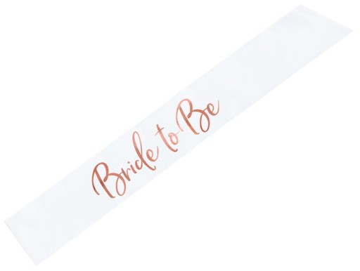 - Szarfa satynowa "Bride to be" w kolorze białym z metalicznym nadrukiem w kolorze różowego złota, szerokość ok. 10 cm, długość ok. 75 cm.