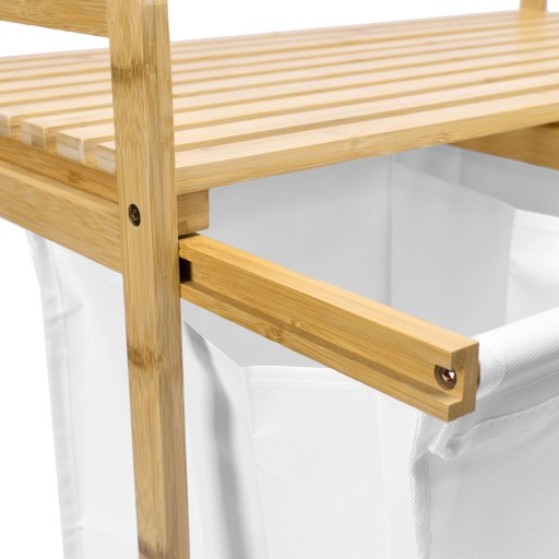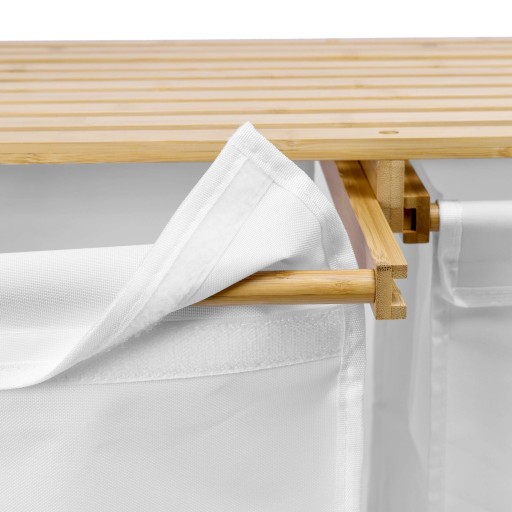 Bambusowy kosz na pranie Hanoi to estetyczny i pojemny kosz, który pomieści mnóstwo odzieży. Wykonany ze szlifowanego bambusa, nie ma ostrych krawędzi, jest przyjemnie gładki i starannie wykończony. Górna półka może służyć jako miejsce na akcesoria łazienkowe, środki piorące, a także jako miejsce na dekoracje czy świece zapachowe. Kosz posiada szyny, które ułatwiają napełnianie i opróżnianie materiałowych worków. Dzięki nim worki można wysunąć i przetransportować. Materiał przypięty jest na rzep, można go zdjąć i wyprać. Hanoi złożysz bez wiercenia i specjalistycznych narzędzi. Montaż zajmuje dosłownie chwilę, a wszystko co niezbędne do jego złożenia znajdziesz w zestawie.