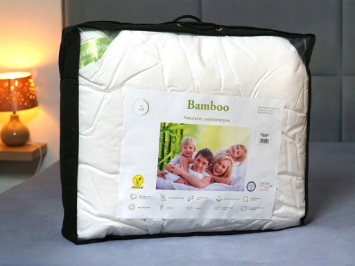 - Poszycie kołdry i poduszki to jedwabista, przyjemna w dotyku tkanina o właściwościach antystatycznych i antybakteryjnych, uzyskana dzięki doskonałemu połączeniu bambusa z bawełną.
