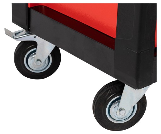 Ten wózek narzędziowy posiada duże, wytrzymałe kółka. Dzięki temu, z łatwością przesuniesz go w każde miejsce w warsztacie. Dodatkowo, jedno z kółek posiada hamulec - dzięki temu, łatwo ustawisz go w wybranym miejscu w warsztacie.