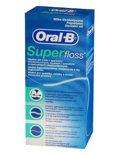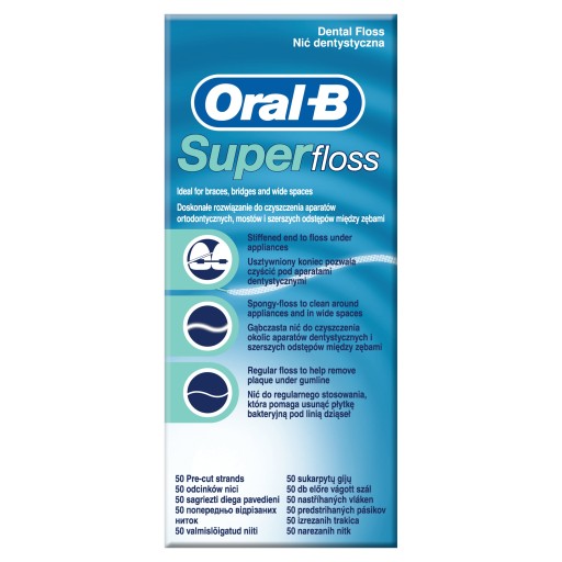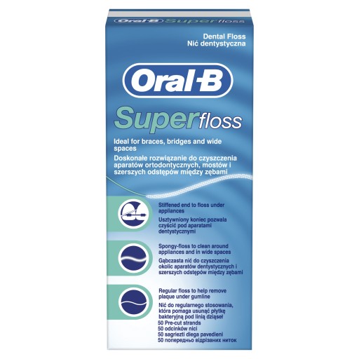 Nić Super Floss® idealnie nadaje się do czyszczenia mostów , aparatów ortodontycznych i większych przestrzeni międzyzębowych. Jej trzy główne elementy - usztywniony koniec, puszysta część oraz standardowa nić - ułatwiają w uzyskaniu uczucia maksymalnej świeżości.