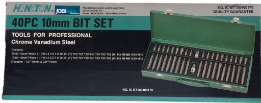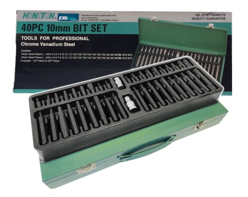 Wykonane ze stali stopowej narzędziowej S2, charakteryzują się wysoką twardością (HRC 58-62) i zwiększona wytrzymałością na ścieranie.Bity mają średnice mocowania 10 mm.Zestaw umieszczony w metalowej kasecie.Każda nasadka w zestawie ma przyporządkowane i podpisane miejsce.Organizer zamykany na zatrzask pozwala na łatwe uporządkowanie nasadek oraz szybki dostęp do każdego elementu.Jakość premium.