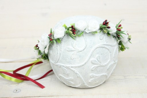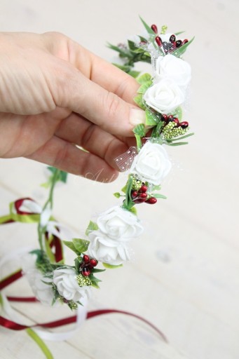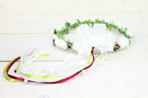 Dodatkowo tył wianuszka posiada odczepianą szyfonową kokardkę z różyczką i sznurem perełek zamocowaną na grzebyku.