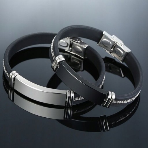 - ✅Stylowa bransoleta wykonana z wysokiej jakości kauczuku oraz stali szlachetnej 316L, zwaną również jako stal nierdzewna, stal jubilerska czy też stal chirurgiczna. Elastyczny pasek w kolorze czarnym idealnie komponuje się ze stalową, czarną blaszką, która dostosowana jest pod personalizację poprzez możliwość wykonania zindywidualizowanego grawerunku. Własny grawer sprawi, że bransoleta stanie się jeszcze bardziej wyjątkowa. Produkt posiada nacięcie, w którym umieszczony jest ozdobny drut nierdzewny w kolorze srebrnym. Ponadto wzbogacona jest o stalowe detale umieszczone po bokach blaszki, co nadaje jej elegancji. Całość prezentuje się bardzo gustownie, a bransoletka stanie się znakomitym dodatkiem do każdego typu kreacji. Produkt posiada solidne zapięcie na zatrzask o błyszczącym wykończeniu tak, jak pozostałe elementy stalowe. Pasek bransolety jest gumowy - dzięki czemu dopasowuje swój kształt do nadgarstka, co sprawia, że jej użytkowanie jest bardzo komfortowe. Produkt stanowi pomysł na idealny prezent z okazji takich jak: Dzień Chłopaka / Mężczyzn, Dzień Kobiet, Urodziny, Imieniny, Walentynki, a również jako bez okazyjny prezent.