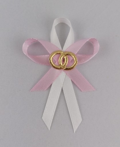 Przypinki wykonane są ręczne, ze starannością i dbałością o szczegóły. Ich wielkość to 5 cm/ 6 cm. Użyto 0,6 mm atłasowej wstążki. Każda przypinka posiada złotą aplikację obrączek. Do każdej wpięta jest szpilka.