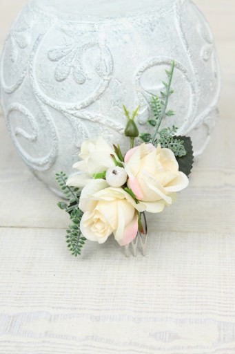 Niezwykły i oryginalny grzebyk do włosów. Wykonany z kwiatów róży w kolorze kremu z bardzo delikatnym odcieniem różu.