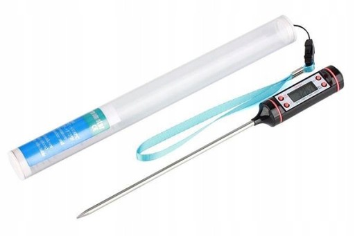 Elektroniczny termometr szpilkowy to doskonałe urządzenie do pomiaru temperatur cieczy, mięs, ciast itp. Duży czytelny wyświetlacz LCD zapewnia łatwy odczyt temperatury a długi stalowy szpikulec pomiar temperatury. Całość wykonana z odpornego na uszkodzenia tworzywa ABS, łatwego w czyszczeniu. Termometr zasilany baterią, ukrytą pod nakrętka wyposażoną w gumowy oring co zapewnia szczelność. Całość zapakowana w eleganckie etui, wyposażone w smycz naręczną.