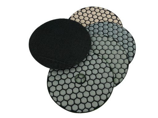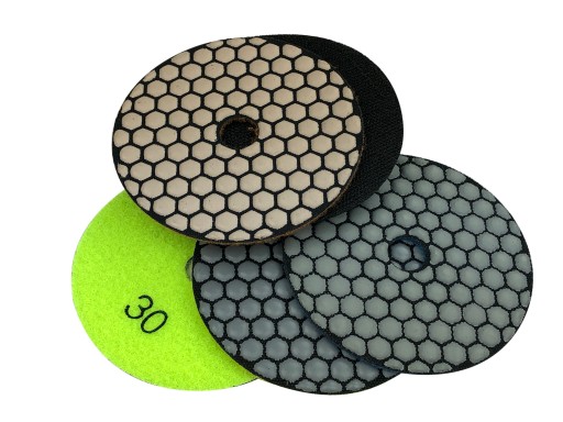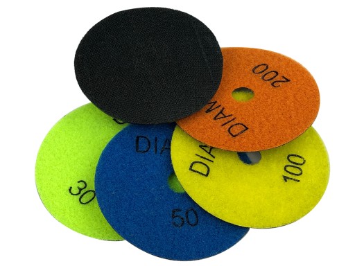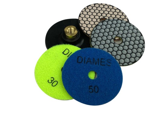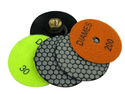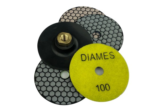 - KOMPLET ZAWIERA 4 SZT DYSKÓW DIAMENTOWYCH POLERSKICH (#30, #50, #100, #200 ) + UCHWYT GUMOWY ELASTYCZNY FI 100 MM GWINT M14