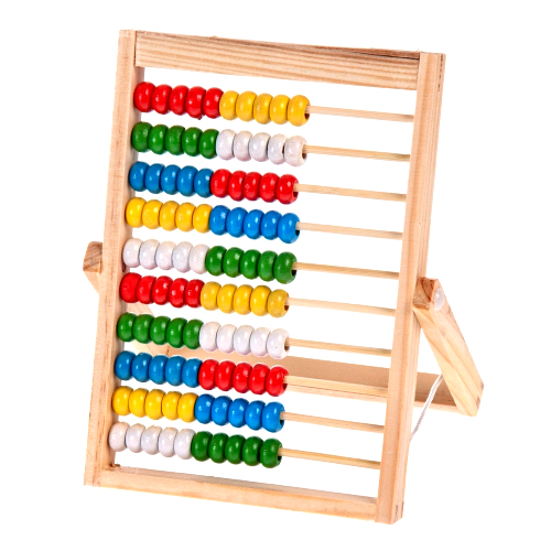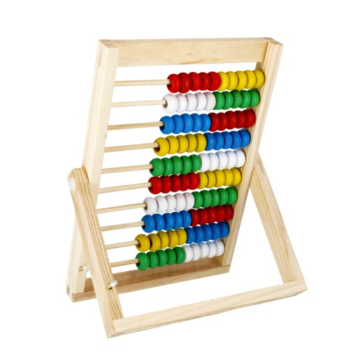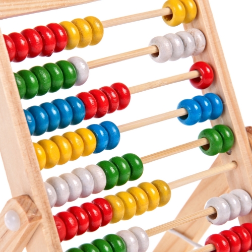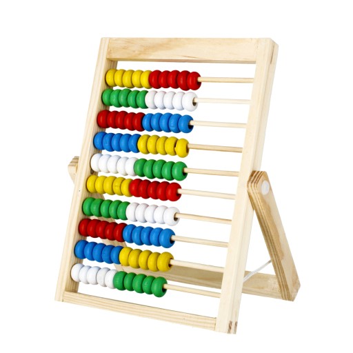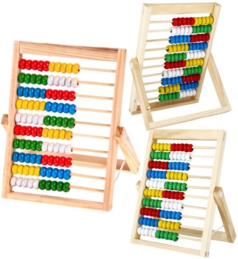 Kolorowe liczydło składające się z 10-rzędów kolorowych koralików, w całości zostało wykonane z drewna.