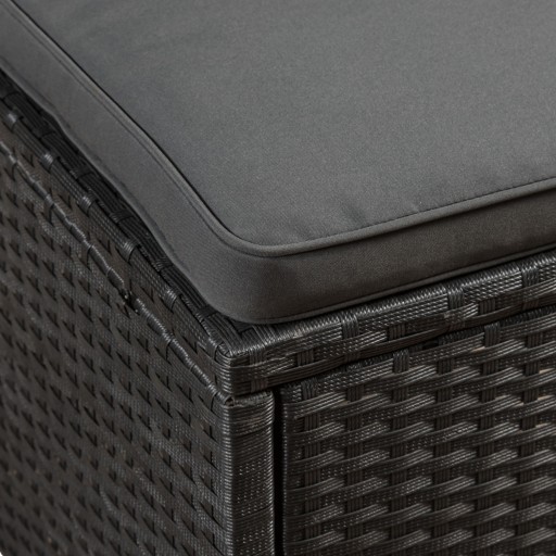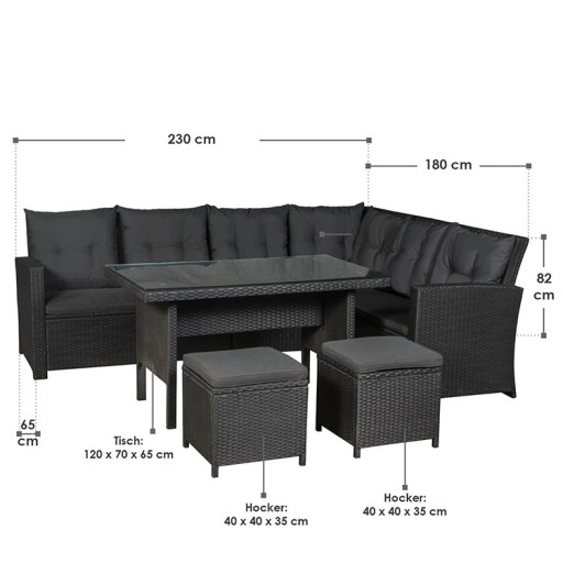 Nawet bez poduszek splot z polirattanu jest niezwykle wygodny. Elastyczne i jednocześnie sprężyste włókna optymalnie dopasowują się do konturów ciała, zapewniając w ten sposób przyjemne uczucie siedzenia. Poduszki siedzisk i oparcia o grubości 5 cm sprawiają, że siedzisko to jest wyjątkowe i miękkie . Dzięki wygodnej wysokości siedziska wynoszącej 45 cm możesz wygodnie odpoczywać podczas długich letnich wieczorów.
