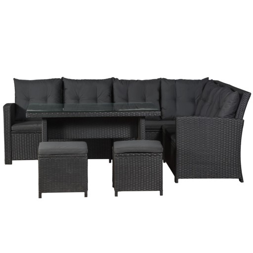 Dzięki polyrattanowemu narożnikowi ogrodowemu z czarnym oplotem, przekształcasz swoją przestrzeń na zewnątrz w stylowe miejsce do relaksu i odpoczynku. Wytrzymała konstrukcja stalowa i odporne na warunki atmosferyczne włókna z poli rattanu sprawiają, że meble ustawione na tarasie pod altaną czy w ogrodzie bardzo ładnie się prezentują. Duży stolik ze szklanym blatem służy jako miejsce do postawienia żywności i napojów. Grube poduszki siedziska i oparcia gwarantują trwały komfort. Wieczory towarzyskie z rodziną, przyjaciółmi lub sąsiadami będą wspaniałym relaksem na świeżym powietrzu.