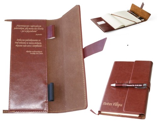 Na tej aukcji oferuje elegancki notes A5 z Twoim grawerem i długopisem z Twoim grawerem. Na notesie grawer z przodu oraz grawer na wewnętrzej stronie - dedykacja. Na długopisie grawer dwustronny.