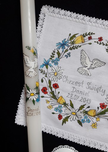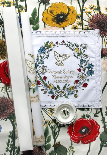 Wzór gołąbek ( Duch Święty) w wianku z kwiatów polnych.