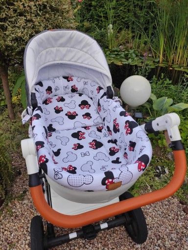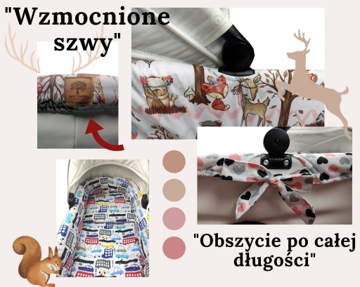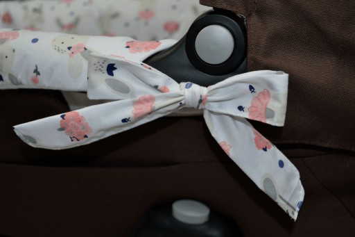 - Dopasowane wywinięcie możliwe dzięki wszytej mocnej gumie wewnątrz wkładu. Całość naciągają państwo według uznania wszytymi trokami, które tworzą ozdobne kokardy po obu stronach wózka.