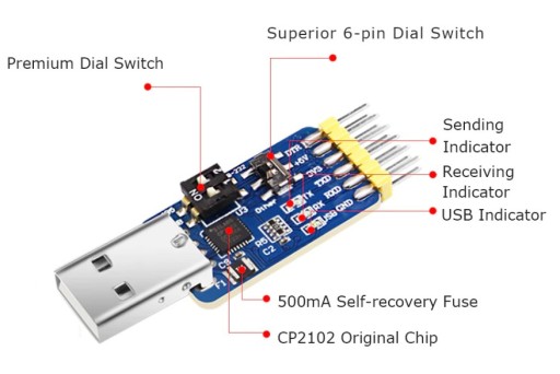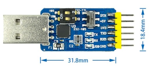 - Wyprowadzone sygnały: RX, TX, GND, 5V, 3,3V,DTR