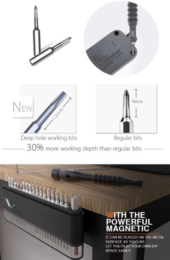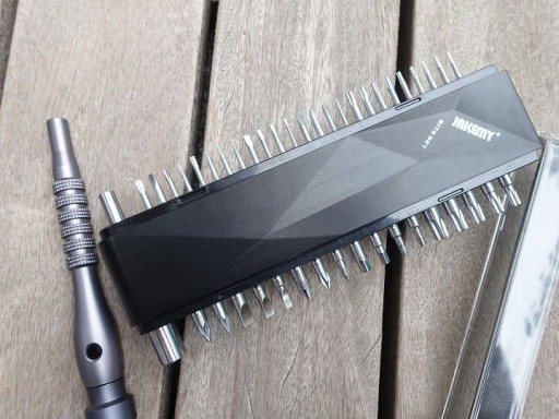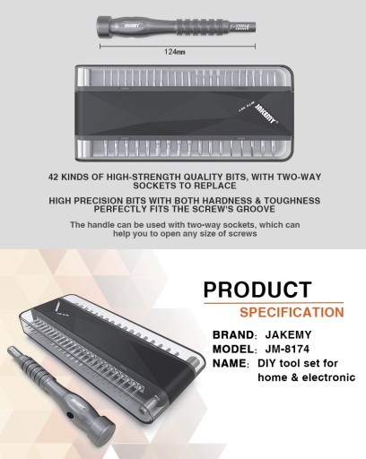 Jakemy JM-8174 to zestaw 42 precyzyjnych magnetycznych bitów z lekkim aluminiowym uchwytem przeznaczony do precyzyjnych napraw serwisowych telefonów i smartfonów w tym produktów Samsung, Huawei, Xiaomi, Oppo oraz Apple tj iPhone, MacBook Air i Pro.