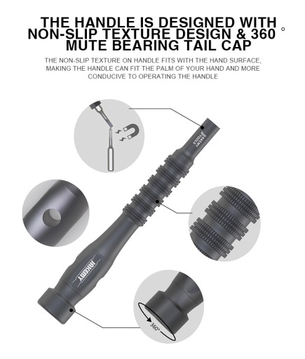 Aluminiowy uchwyt na bity jest bardzo lekki oraz posiada obrotową główkę przyspieszającą odkręcanie i wkręcanie. Posiada również otwór dzięki któremu może służyć jako dźwignia.