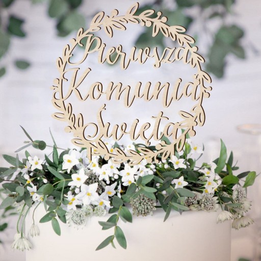 - skład: topper na tort na Komunię z napisem Pierwsza Komunia Święta w wianuszku z listków; topper posiada charakterystycznie opalane brzegi oraz szpikulce, które ułatwiają jego wbicie w tort