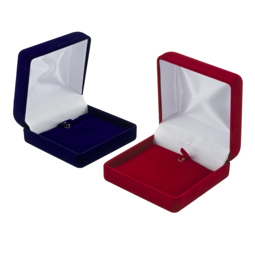 - kwadratowe, flokowane opakowanie jubilerskie w kolorze czerwonym lub szafirowym do wyboru