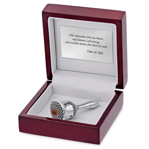 Nasza grzechotka to ekskluzywny prezent z okazji narodzin, chrztu lub nawet pierwszych urodzin dziecka. Jest to piękna pamiątka cudownych niezapomnianych chwil.