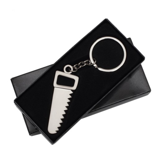 Brelok metalowy w kształcie piły.