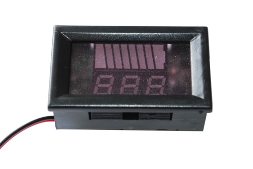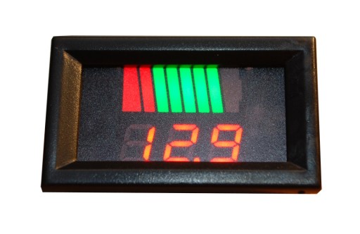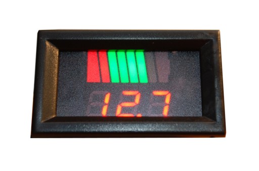 Miernik naładowania baterii, akumulatora - woltomierz panelowy, 12V / 24V. Miernik wskazuje w sposób graficzny poziom naładowania baterii, wyświetla również wskazanie napięcia w woltach. Zakres pracy jest zmieniany automatycznie, tj. powyżej ok. 18V miernik przeskakuje na poziom 24V i pokazuje najniższy poziom naładowania akumulatora.